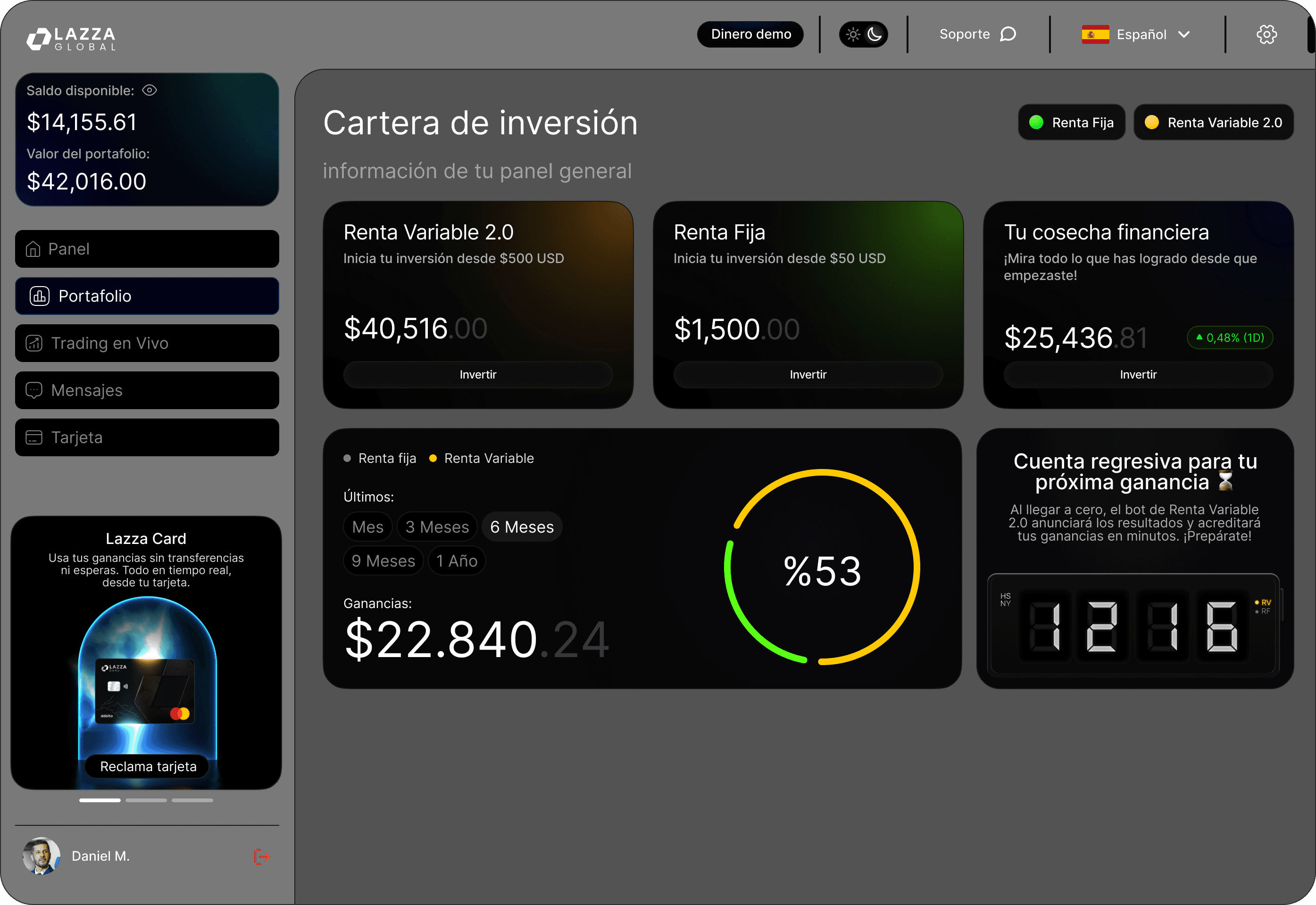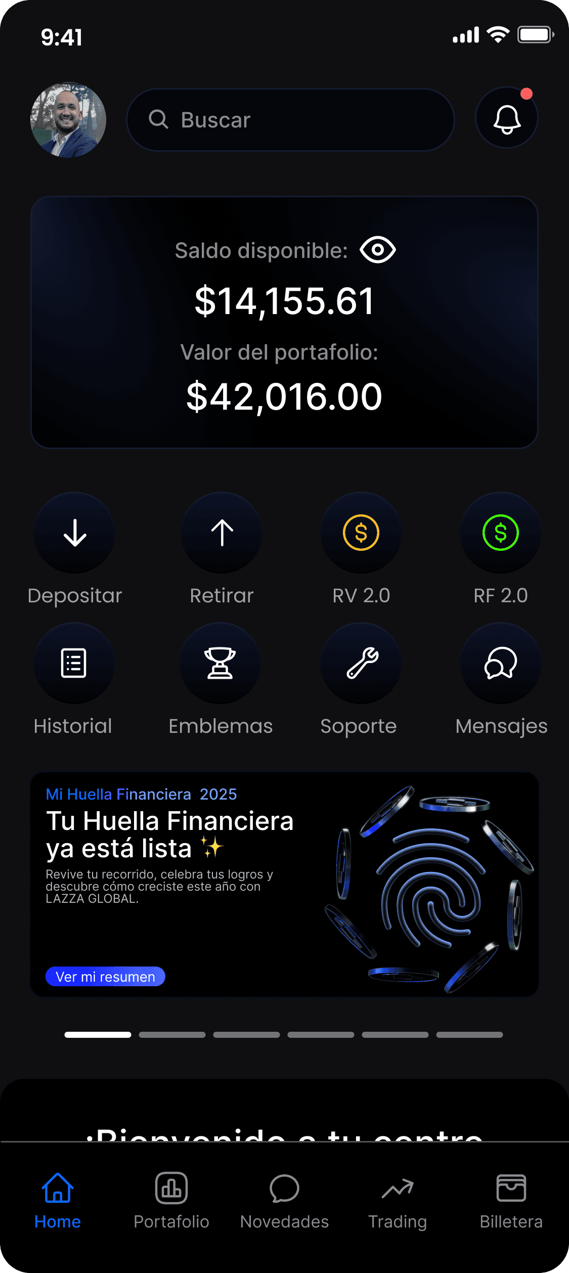 Lazza Global es pionera en democratizar el acceso a los mercados internacionales. Desde inversiones en Renta Fija 2.0, con un 1% mensual fijo, hasta operaciones diarias en Renta Variable 2.0, combinamos inteligencia artificial y un equipo de expertos para brindar informes frecuentes y control total de tus ganancias. No importa tu nivel de experiencia: con una inversión mínima de 50 USD o 500 USD (dependiendo del producto), puedes acceder a un panorama global sin las limitaciones tradicionales.